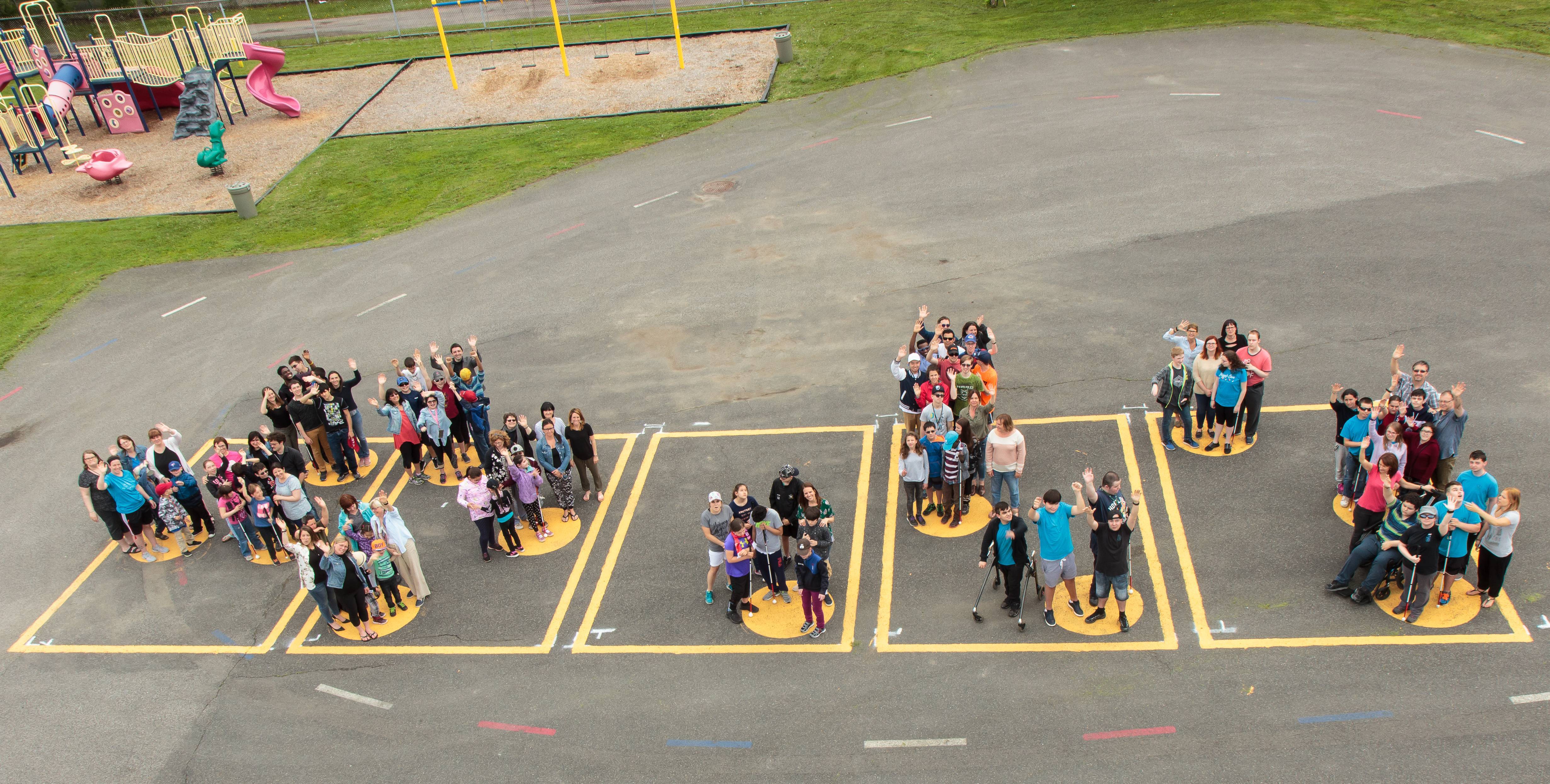 Pour l’occasion, des cellules braille géantes ont été peinturées sur le sol formant les mots « 25 JO ». Une photo a été prise avec les élèves et le personnel prenant place physiquement sur chacune d’elles.