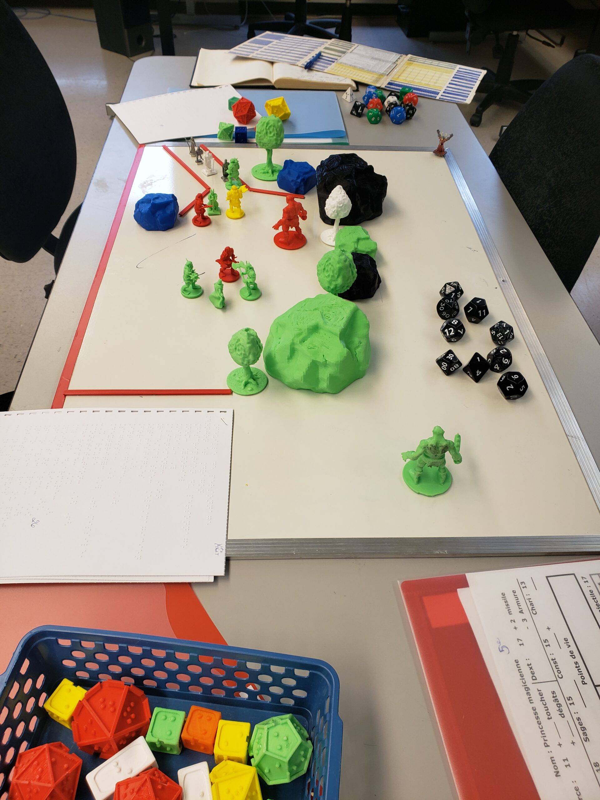 Afin d’assurer l’accessibilité de ce jeu de rôle, l’achat de dés surdimensionnés à contrastes élevés a été nécessaire. De plus, avec l’imprimante 3D, des dés en braille respectant le code Antoine, différents personnages et objets en reliefs, indispensables pour les parties de Donjon et Dragon, ont été conçus et aimantés. Les règles ont également été simplifiées et adaptées pour maximiser les 50 minutes consacrées au jeu.