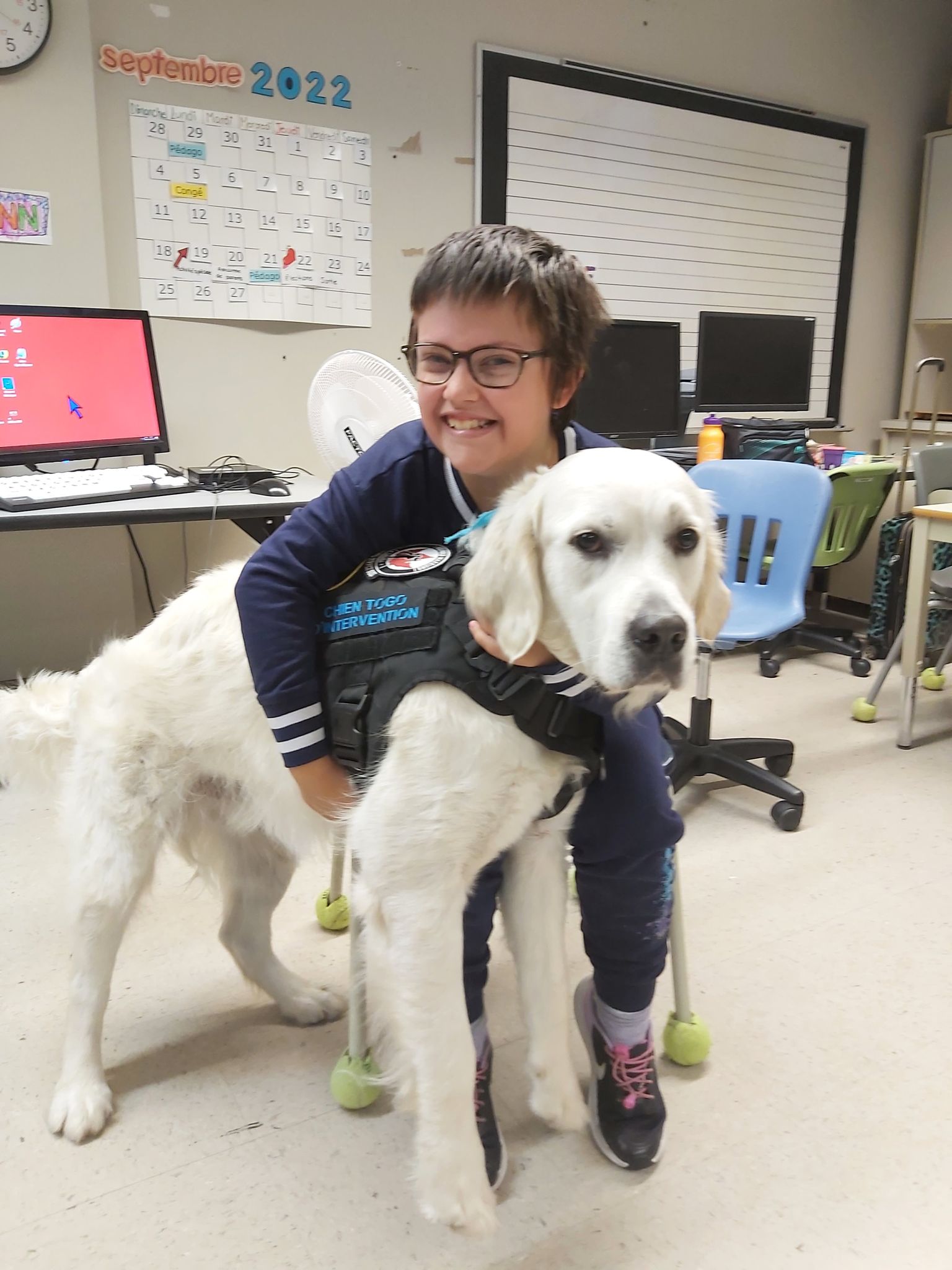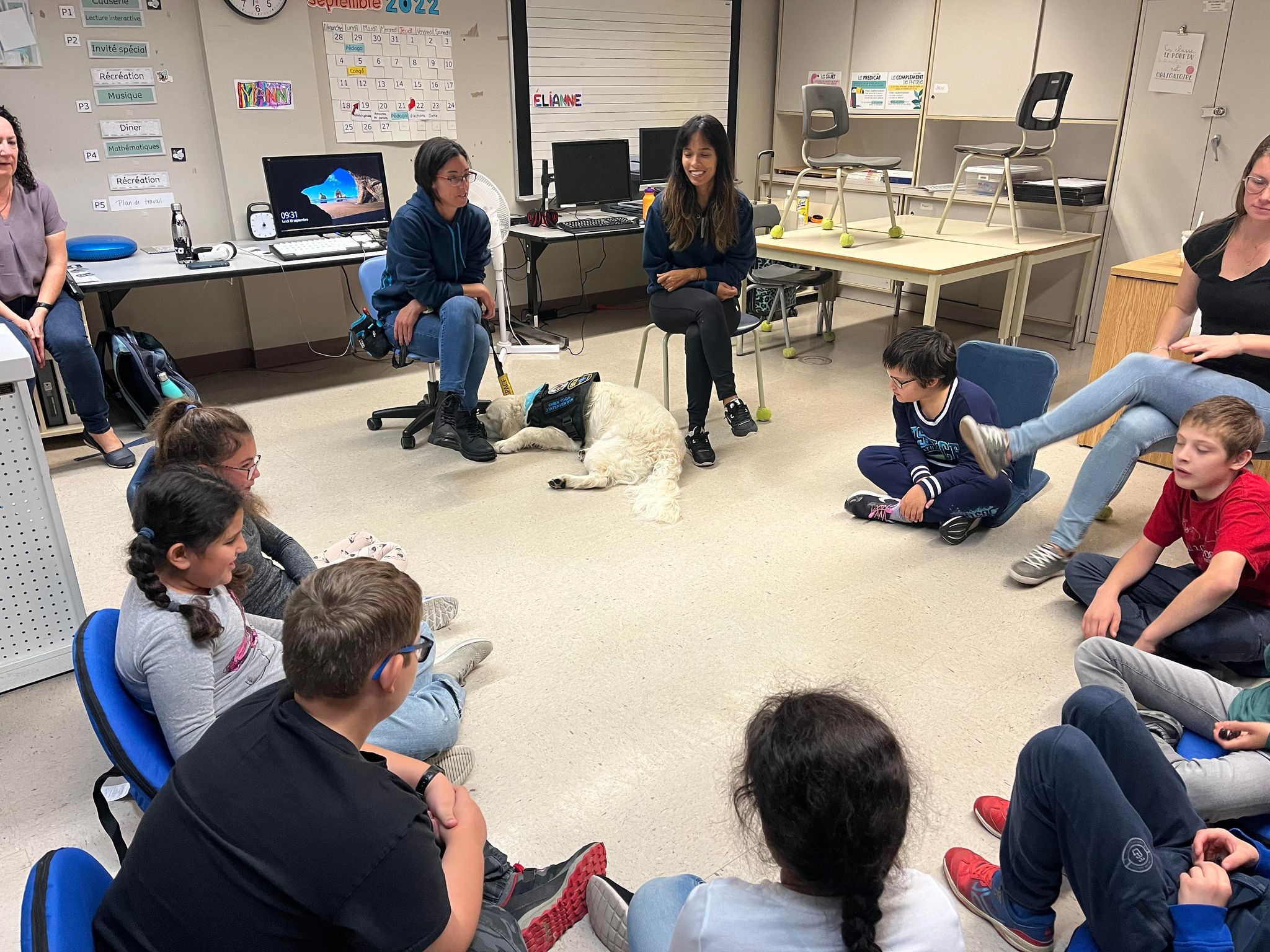 Un chien d’assistance, Spéro, de l’organisme Les chiens Togo, est venu visiter les élèves en compagnie de ses éducatrices canines Pascale et Nancy. Celles-ci ont pris le temps d’expliquer aux élèves les bienfaits d’un chien d’assistance dans la vie des personnes vivant diverses difficultés affectant leur qualité de vie telles que les traumatismes, le trouble du sommeil, l’anxiété, la phobie sociale et l’autisme.