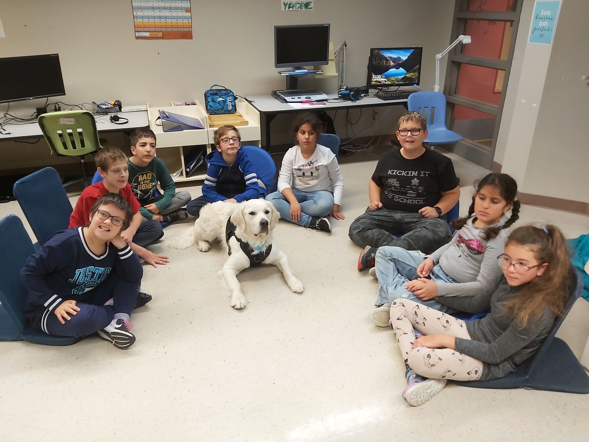 Les élèves ont pu échanger avec les éducatrices, en apprendre davantage sur le rôle d’un chien d’assistance, mais surtout prendre du temps avec Spéro pour s’apaiser et sourire.