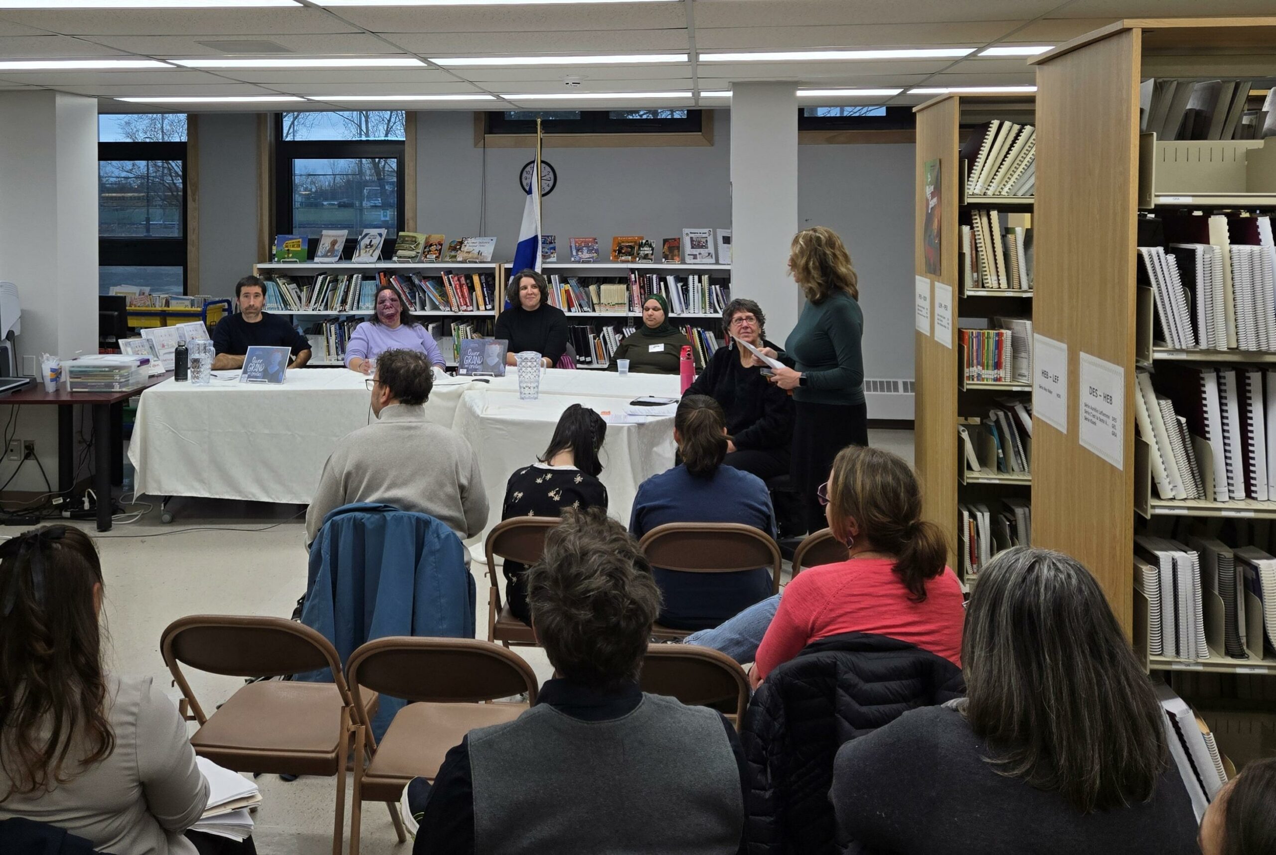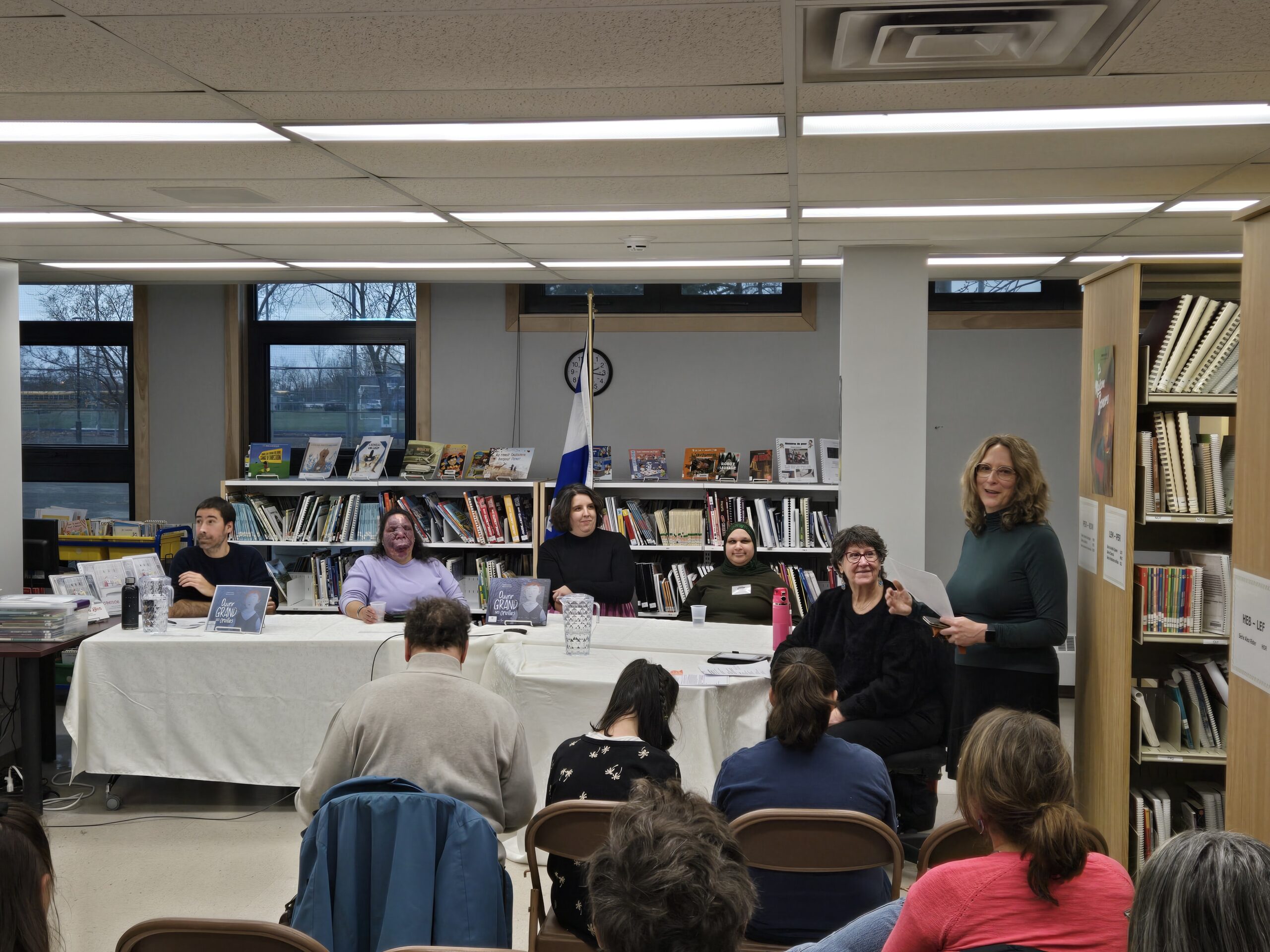 Salma Moudrika (INCA), Janie Lachapelle (Institut Nazareth et Louis-Braille), Ariane Chalifoux (BAnQ) et David Choquette (Bibliothèque Jacques-Ouellette) ont échangé des idées novatrices, soulignant l’importance du travail collaboratif pour promouvoir le braille et le partage des données. L’animation professionnelle et conviviale de Marie Lalande a su favoriser la discussion entre les panellistes, les élèves, Nathalie Pelchat du MEQ, Nicolas Trost des Éditions Les 400 coups ainsi que des actrices du milieu littéraire, pédagogiques et braille.